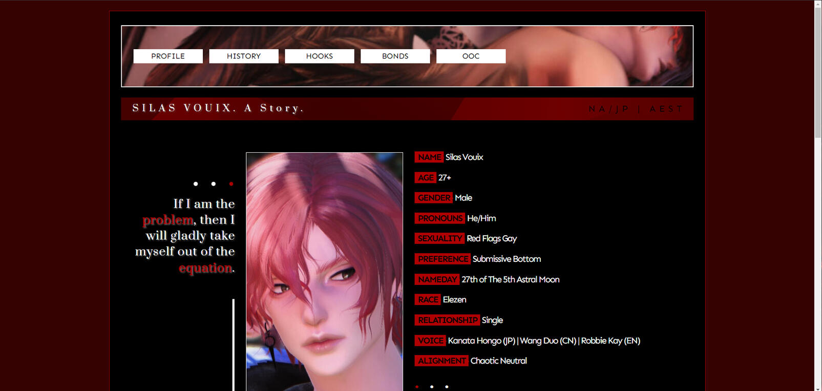 - Usually Landing Page/Profile, History, Hooks & OOC Details -